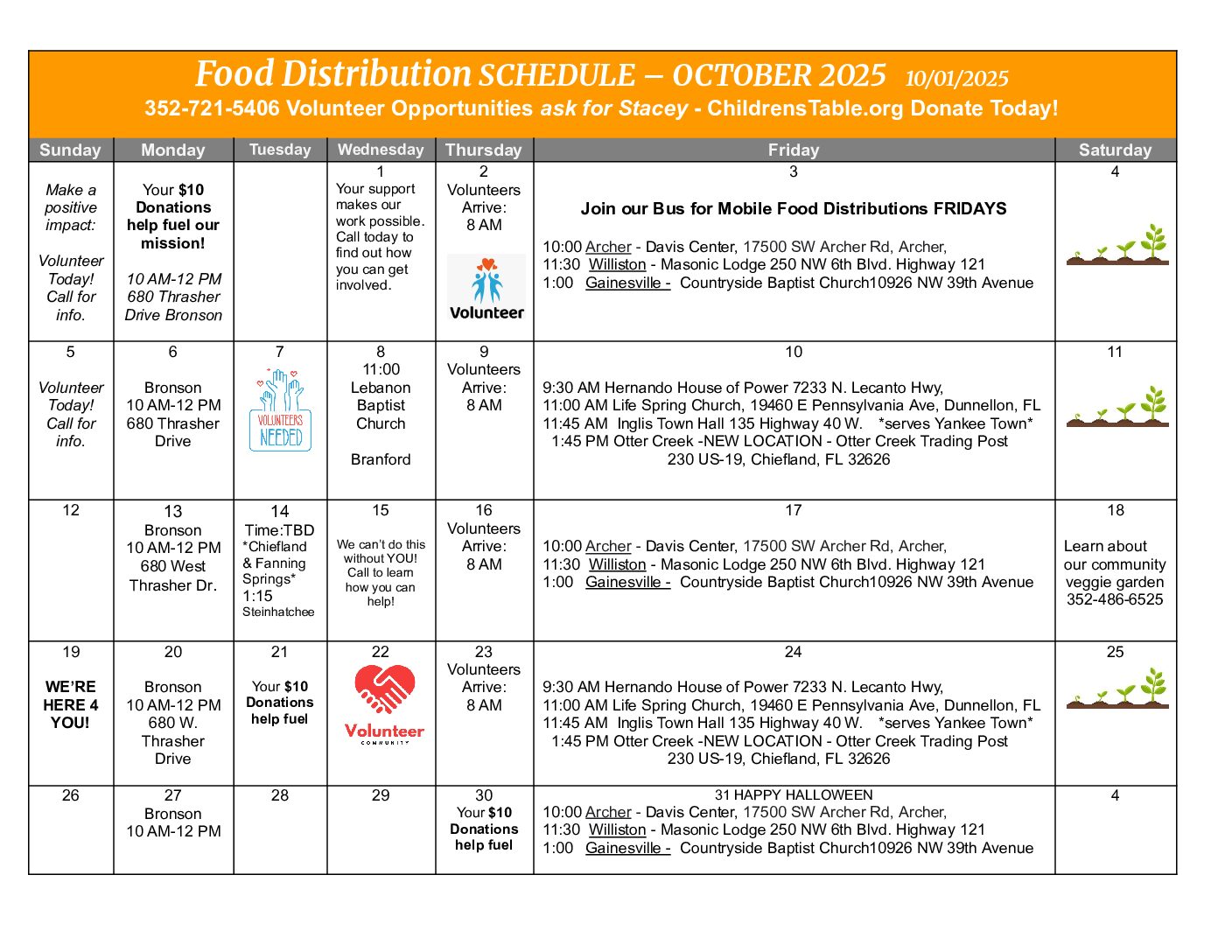 Affordable Food Distribution Times & Locations – The Children’s Table, North Central FL